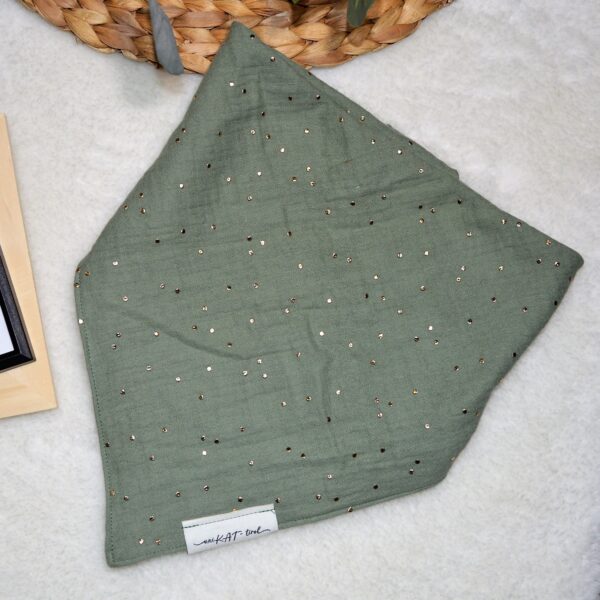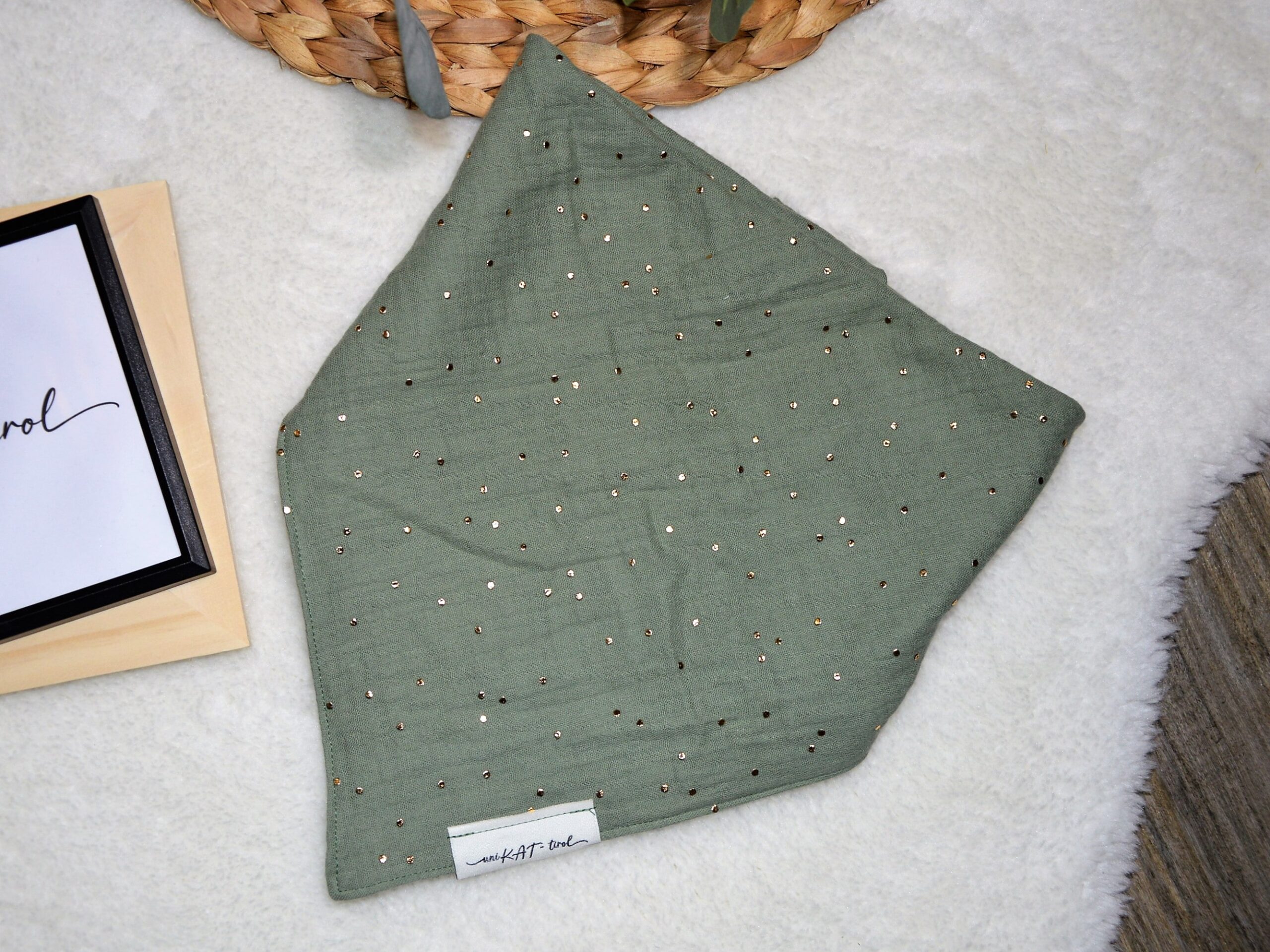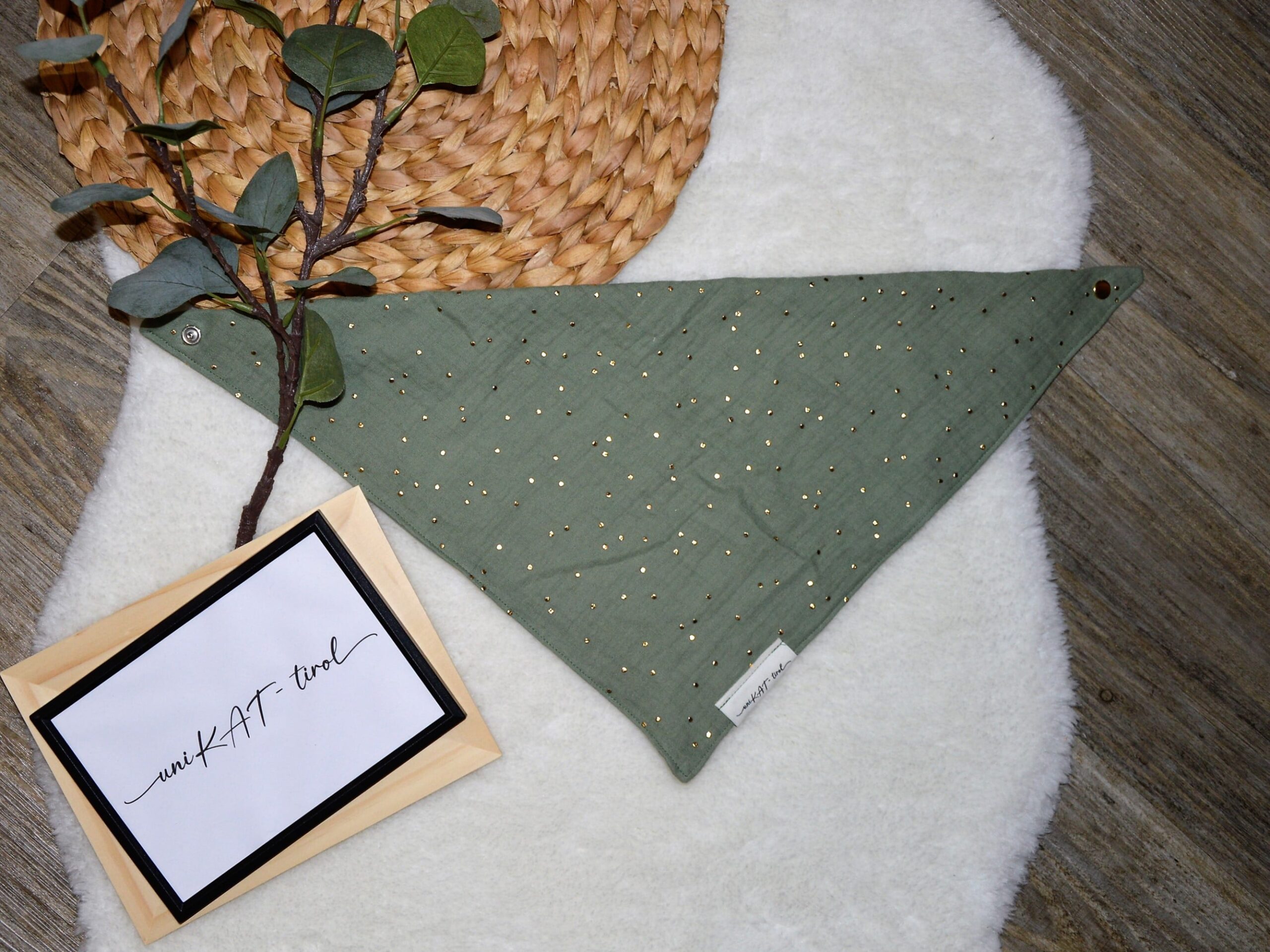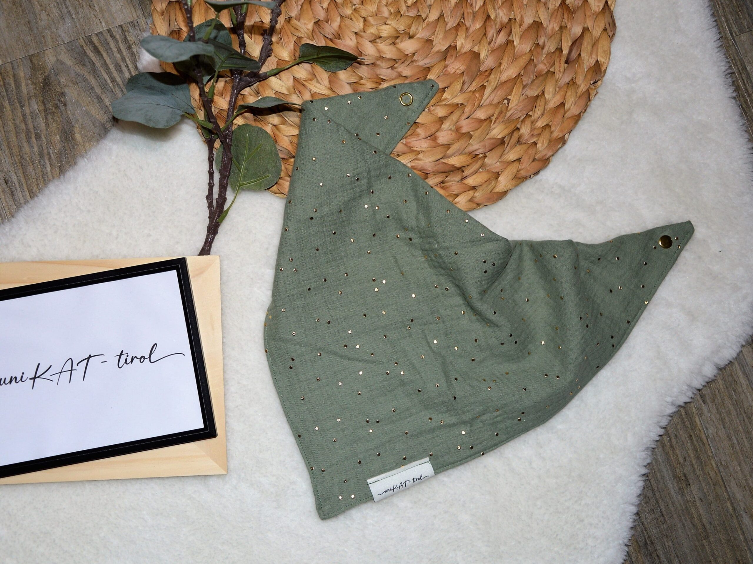 • Dreieckstuch aus Musselin mit Druckknopf im Nacken für leichtes Öffnen und Schließen