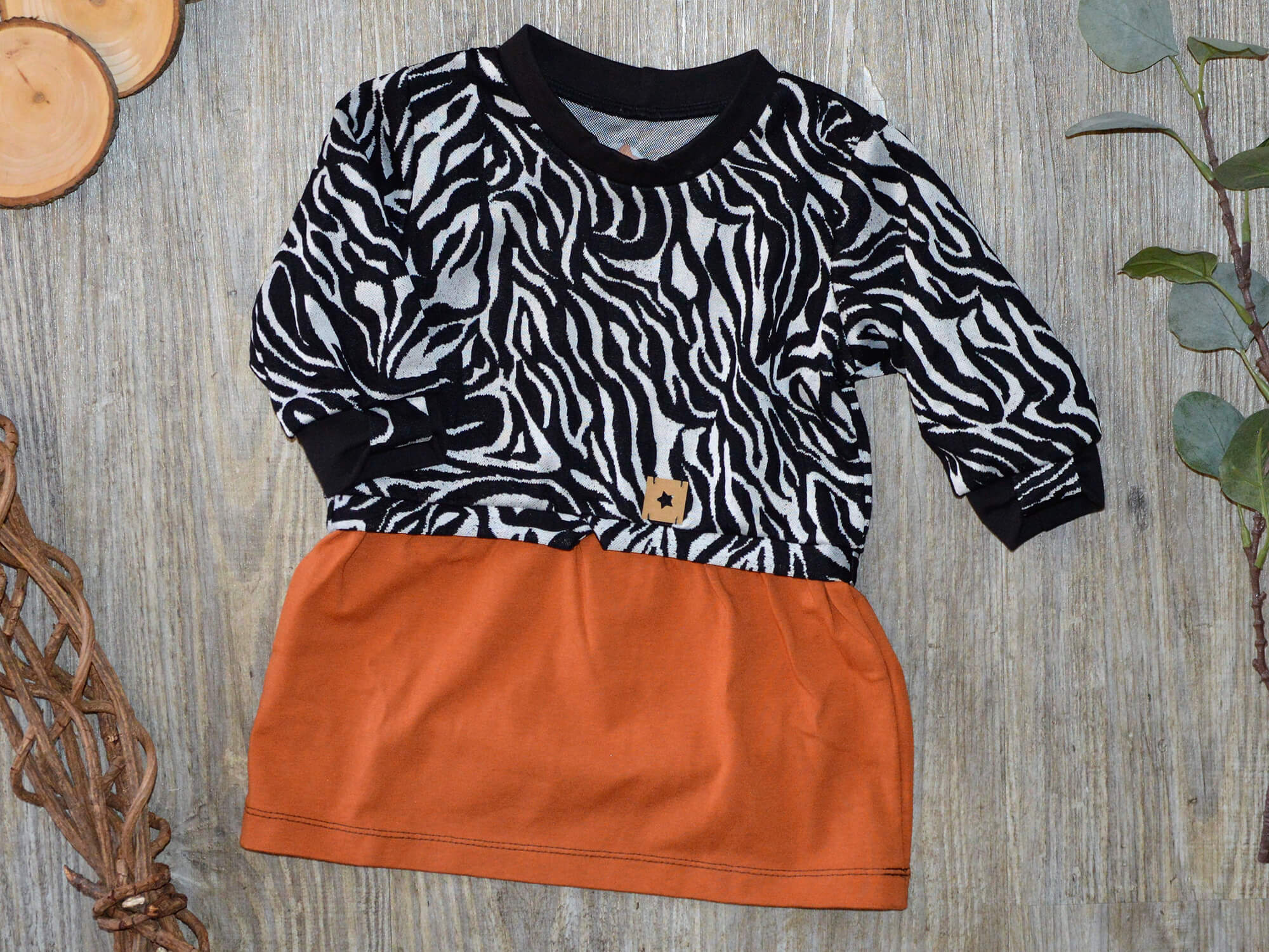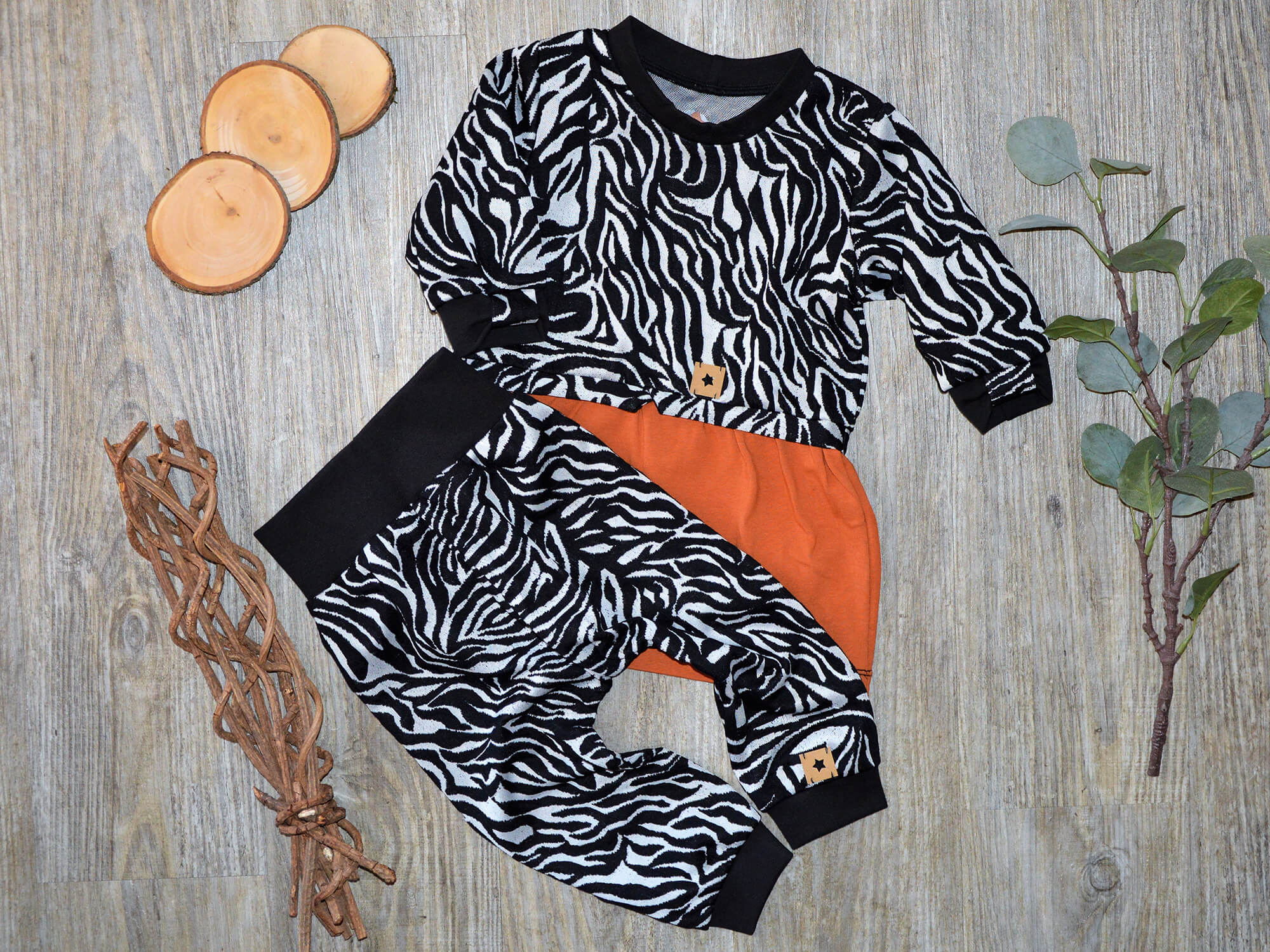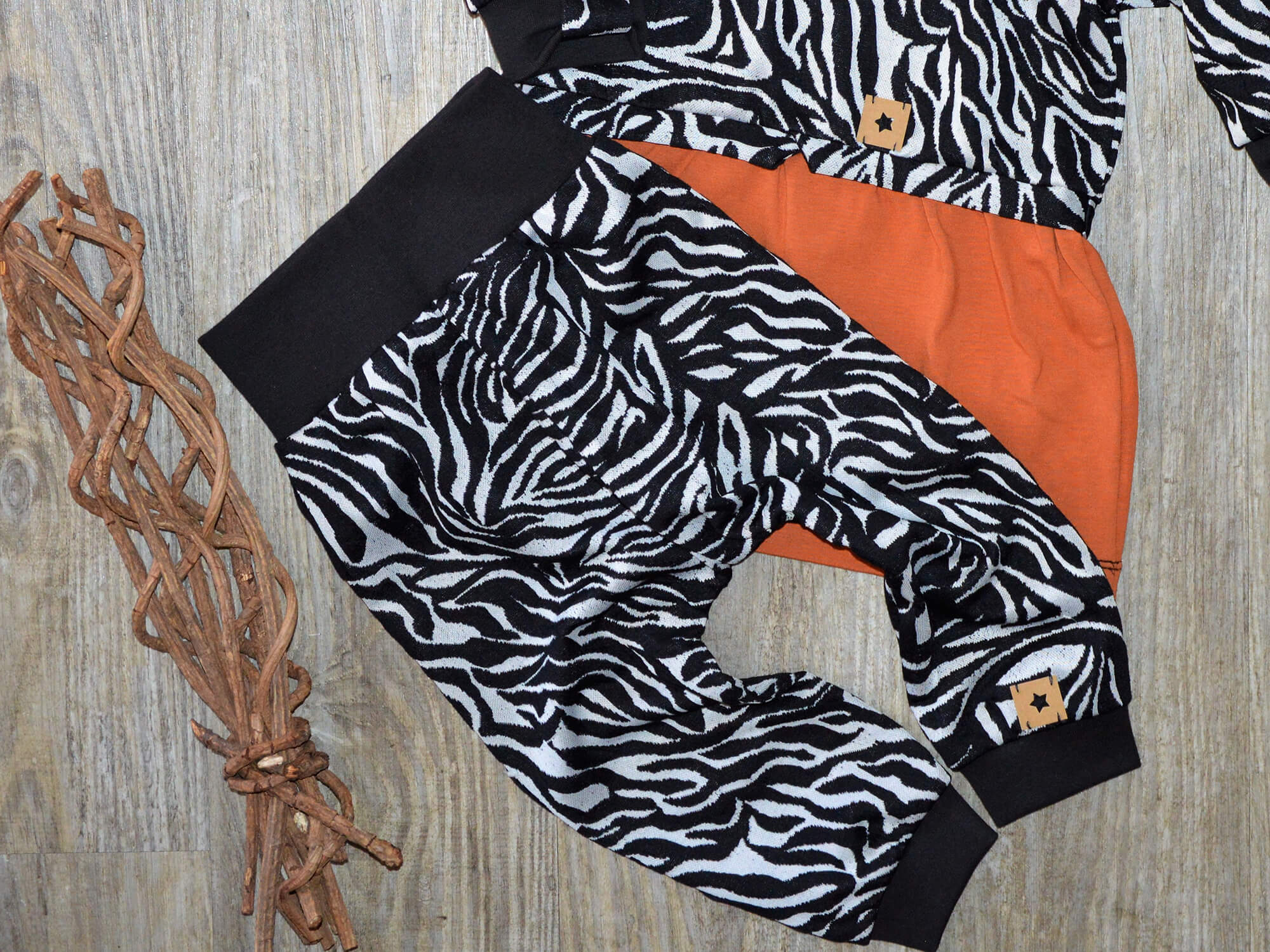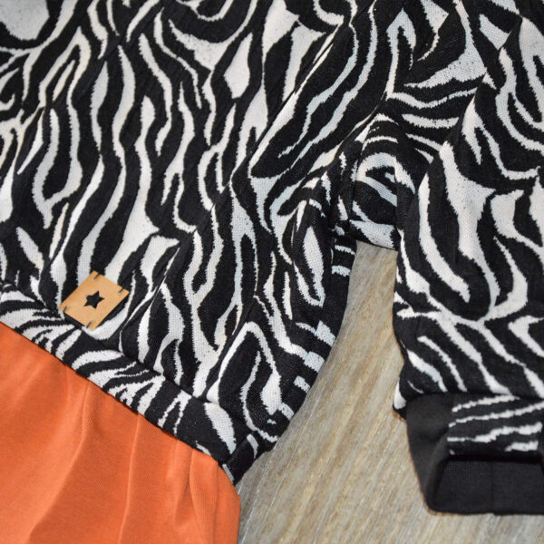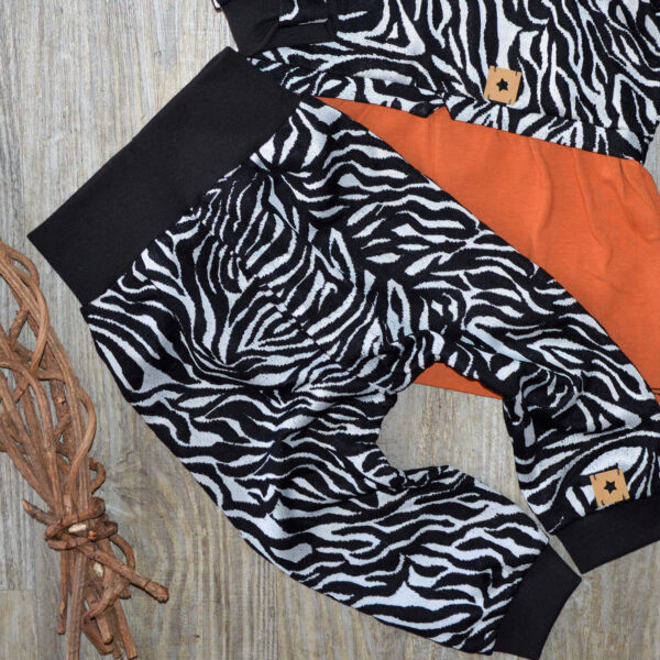 Set „Kleines Zebra“ in Schwarz-Weis / Rost aus Pulli mit Kleidervoulant und Checker Pants – Gr. 74