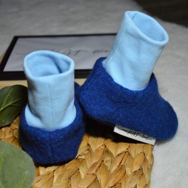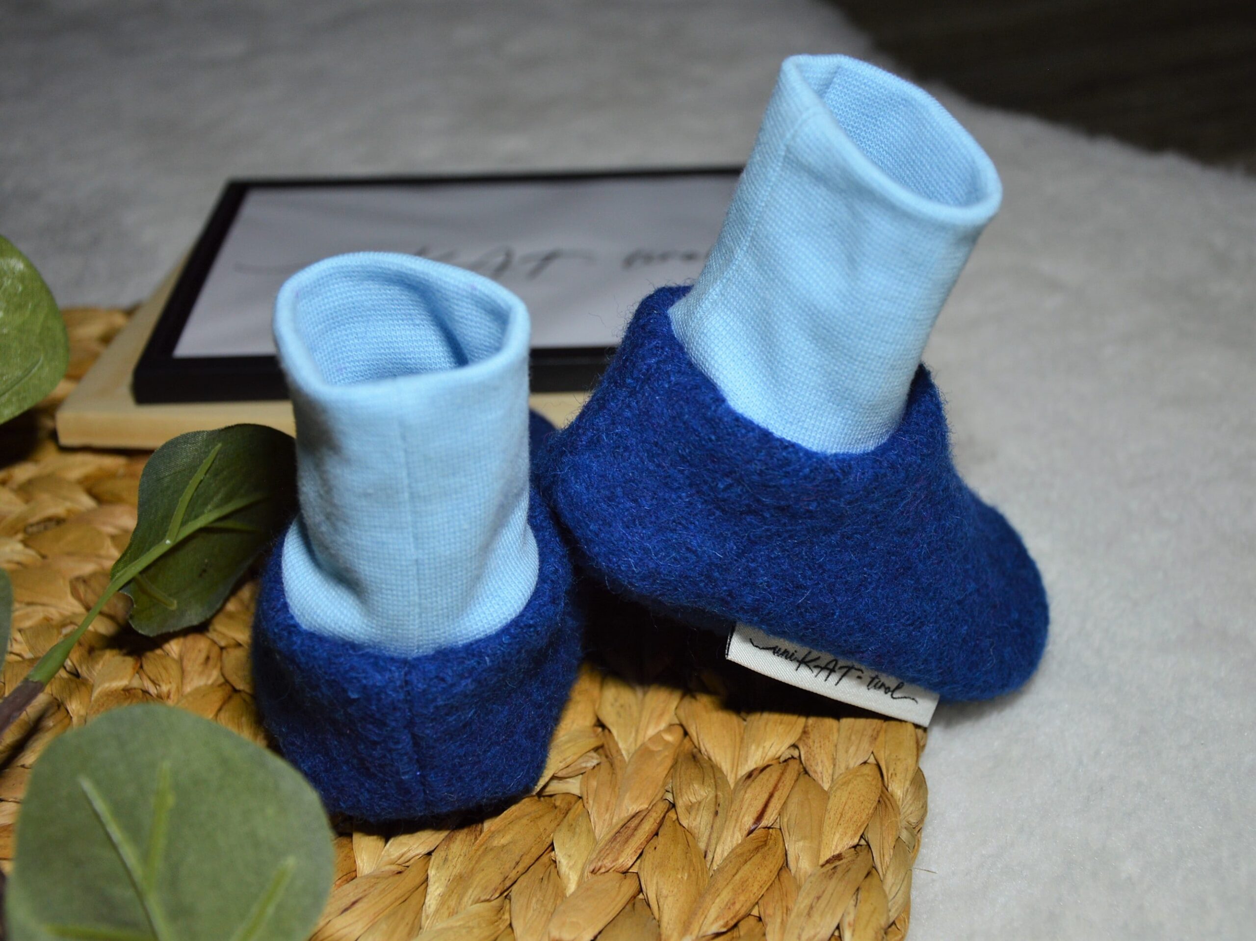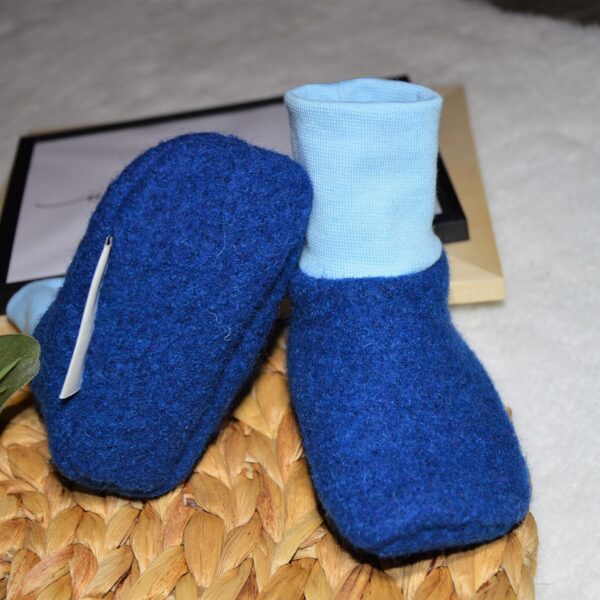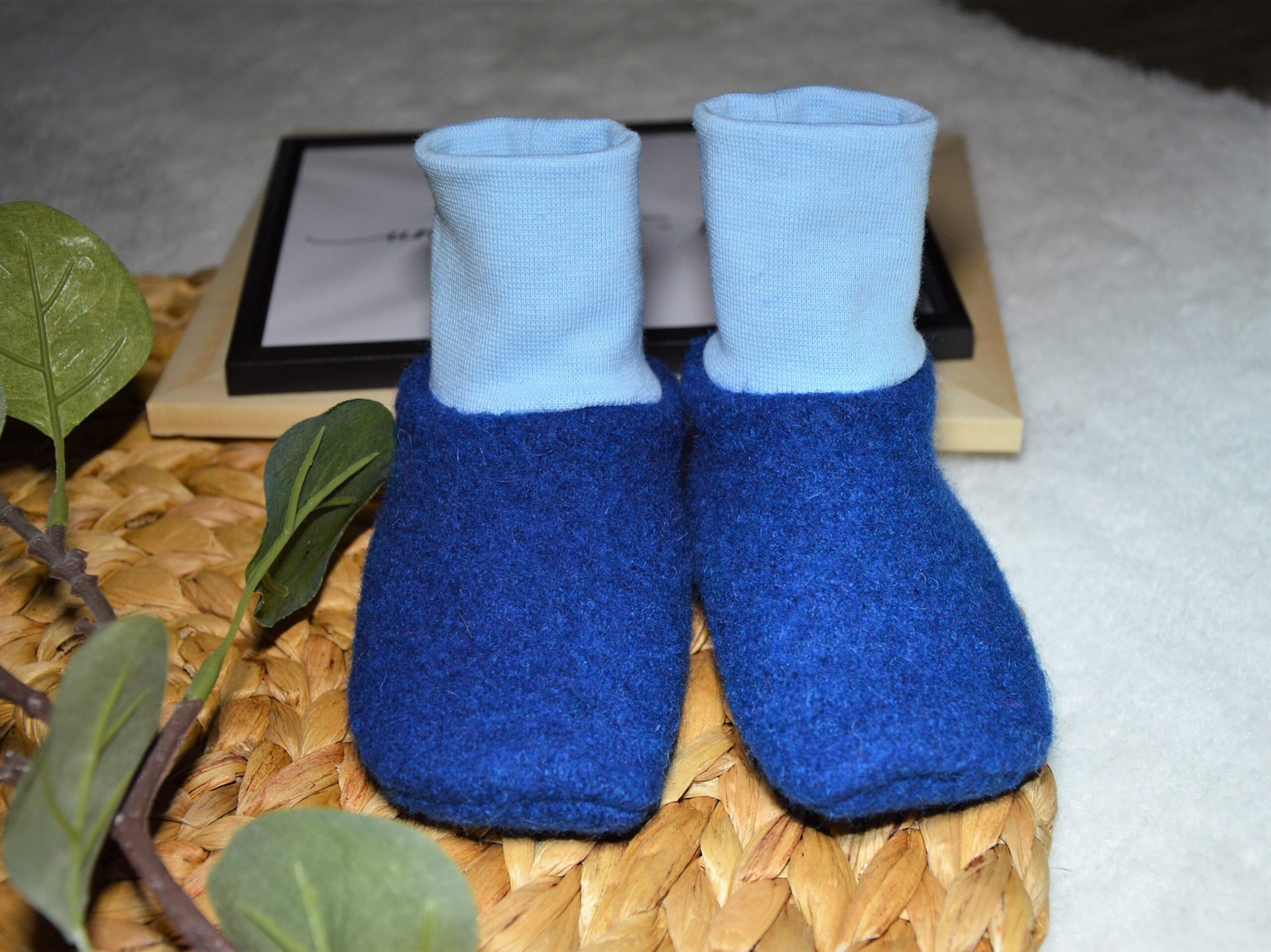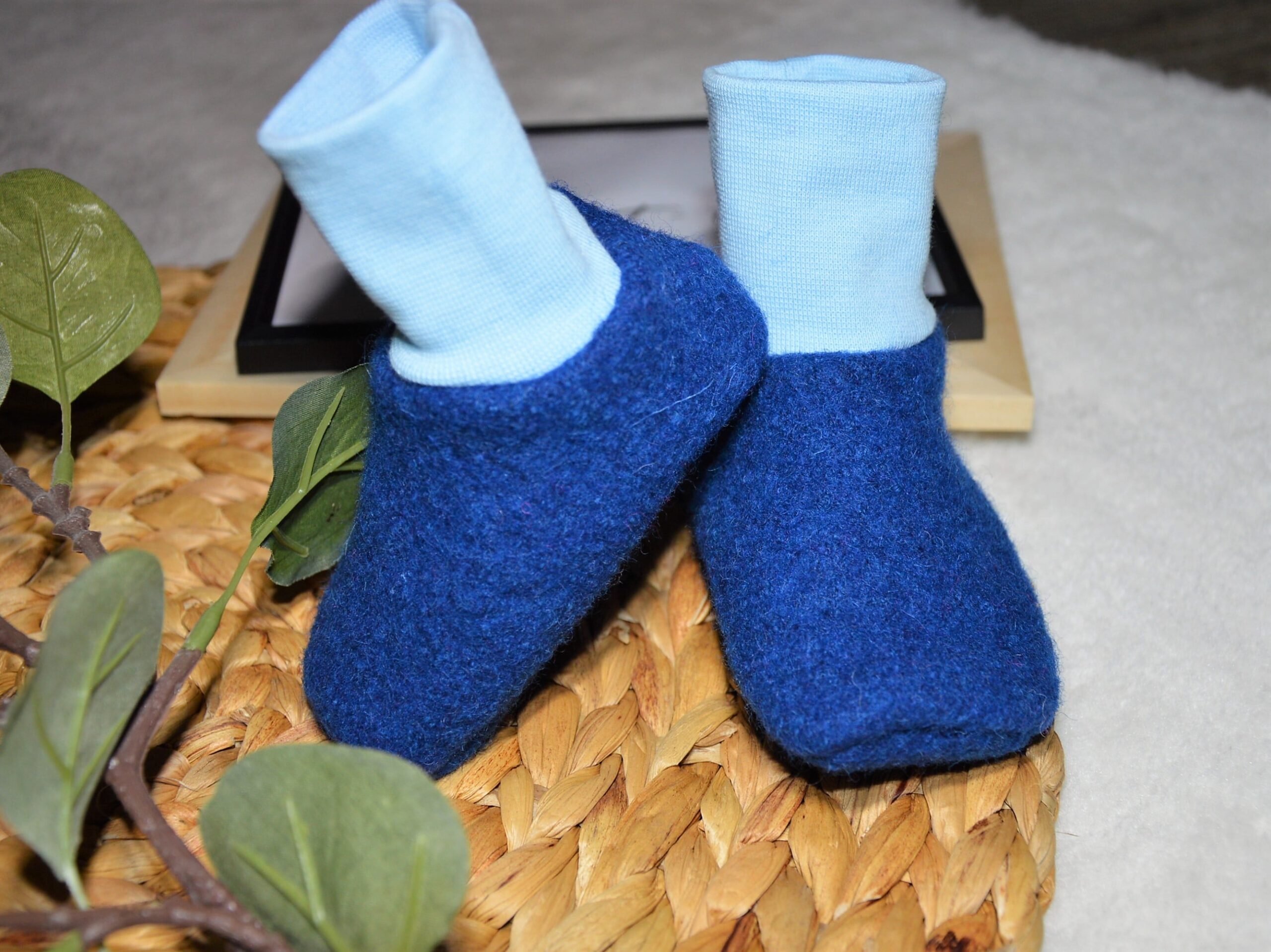 • Patschen aus Wollwalk mit Jersey gefüttert und Bündchen für guten Halt
